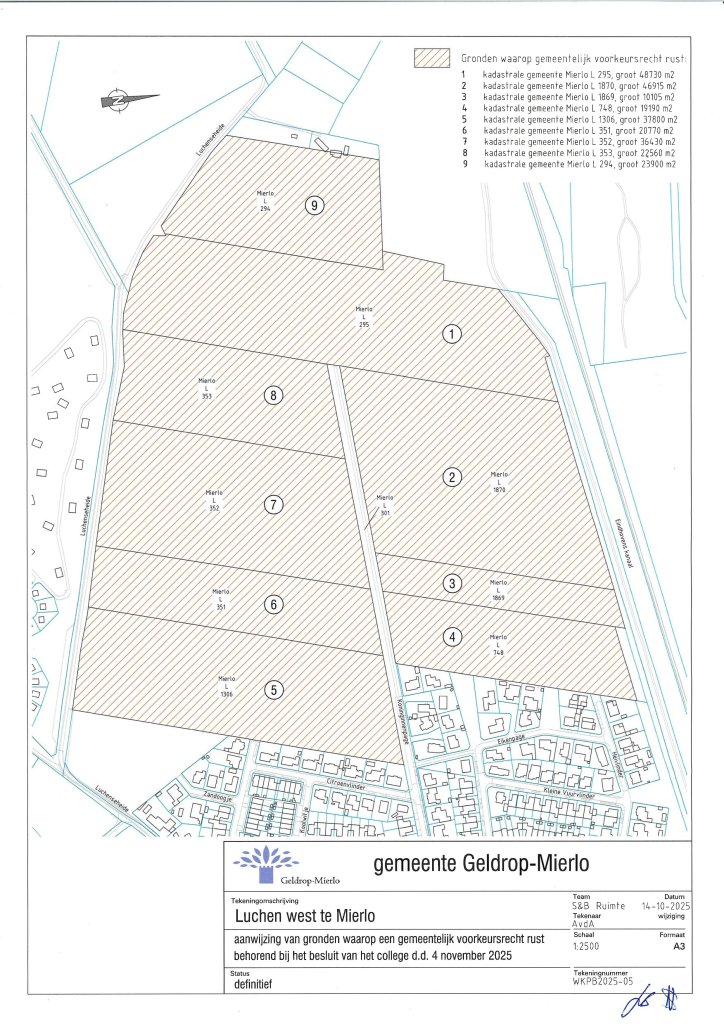 Het college van burgemeester en wethouders van Geldrop-Mierlo heeft op dinsdag 4 november de Wet voorkeursrecht gemeenten (Wvg) gevestigd op de akkers achter Luchen fase 2: Luchen West (zie het kaartje bij dit artikel).